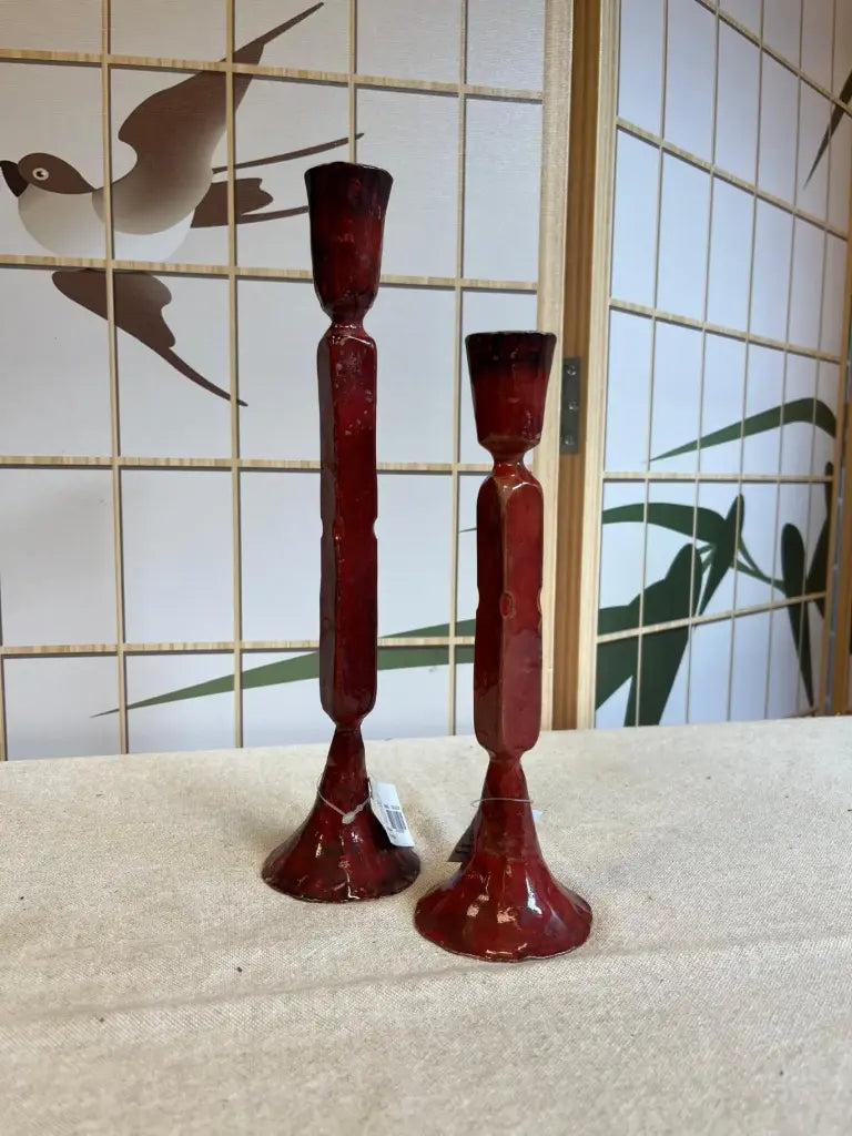 Deze elegante rode kandelaar van metaal brengt instant warmte en kleur in je interieur. De rode kleur zorgt voor een opvallend accent op je tafel, dressoir of vensterbank. Door de twee verschillende hoogtes kun je een mooi speels effect creëren door ze te combineren. Perfect voor een romantisch diner of als decoratief element in je woonkamer.