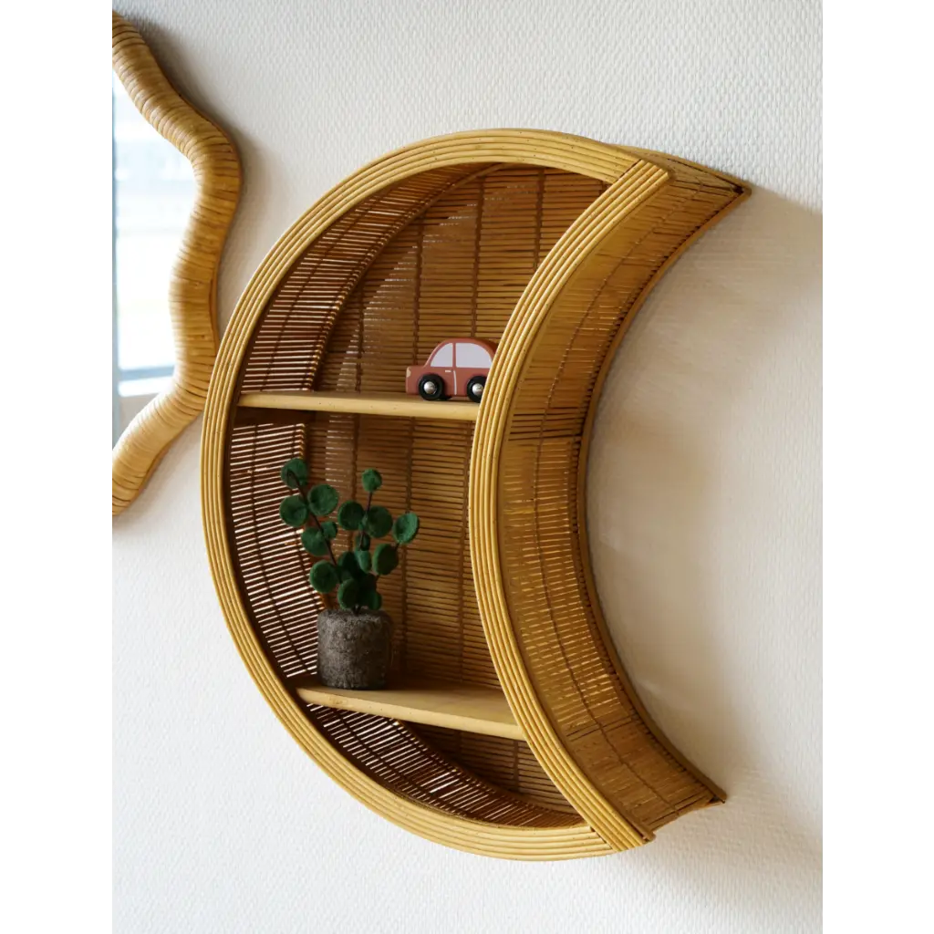 Wandrek van rotan in de vorm van een maan, voorzien van 2 plankjes. Mooi om als wanddecoratie en als wandrek te gebruiken.