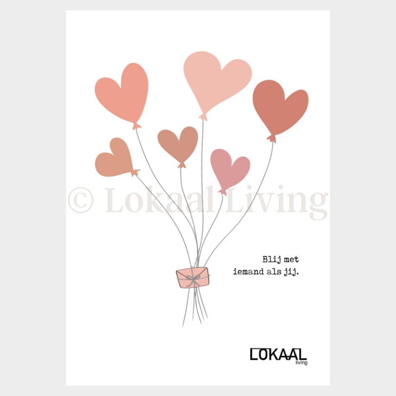 Deze hartverwarmende Wenskaart Blij met iemand als jij van Lokaal Living toont vrolijke hartjesvormige ballonnen met de tekst 'Blij met iemand als jij'. Perfect om iemand te laten weten hoe dankbaar je bent dat ze in je leven zijn!