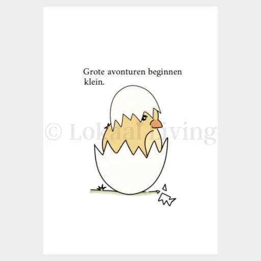 Deze inspirerende Wenskaart Grote avonturen beginnen klein van Lokaal Living toont een schattig kuikentje met de motiverende tekst 'Grote avonturen beginnen klein'. Perfect om iemand te inspireren en te herinneren dat elke grote reis begint met een eerste stapje!